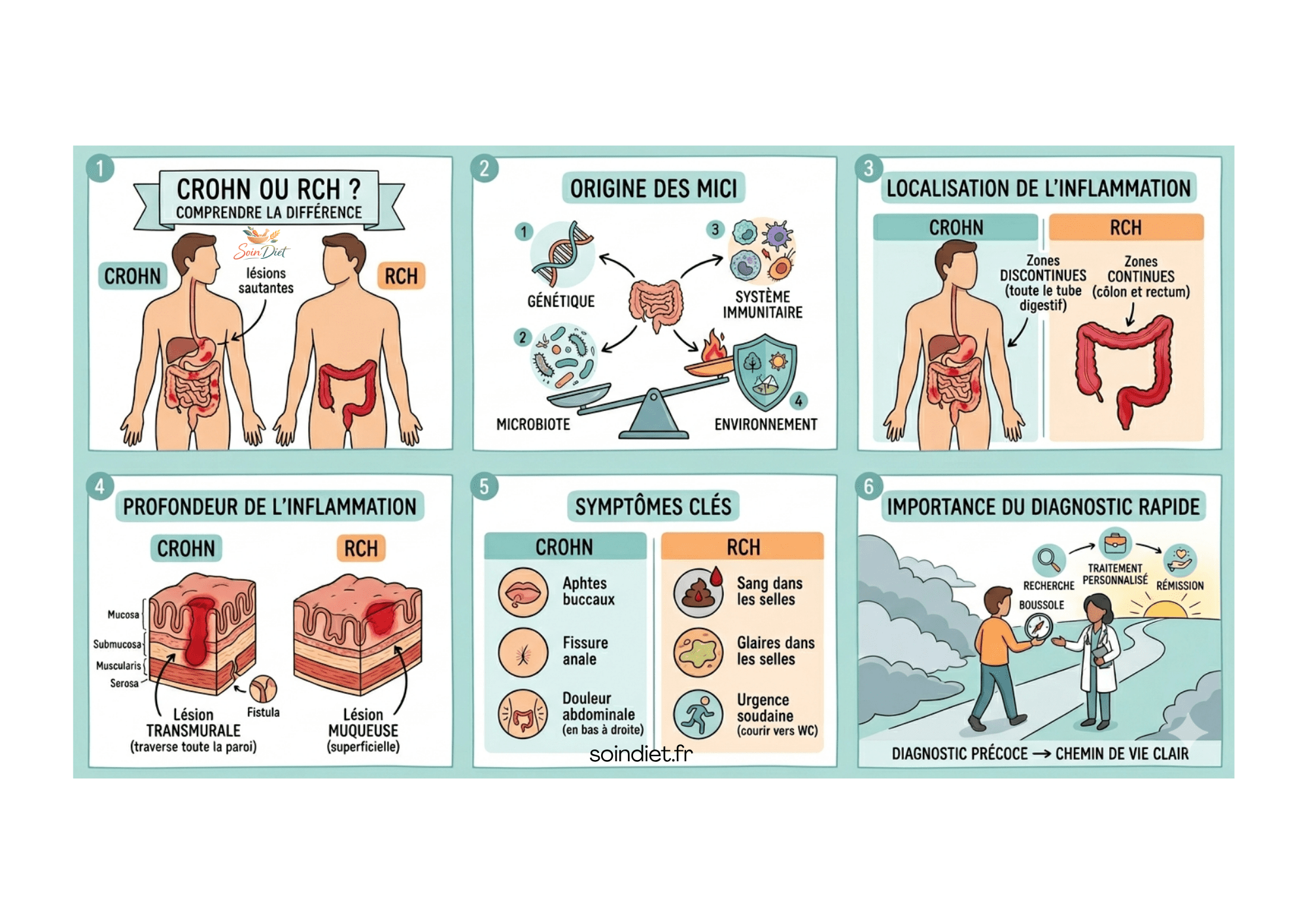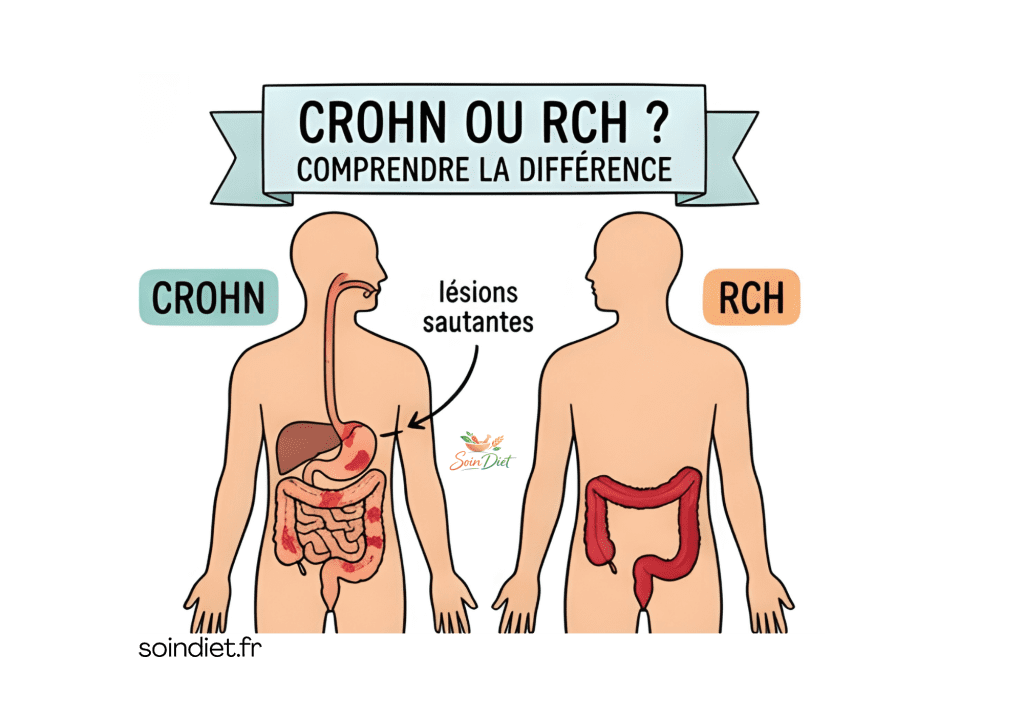 À retenir : la RCH reste dans le gros intestin, tandis que la maladie de Crohn peut concerner l’ensemble du tube digestif et se présenter par plaques.