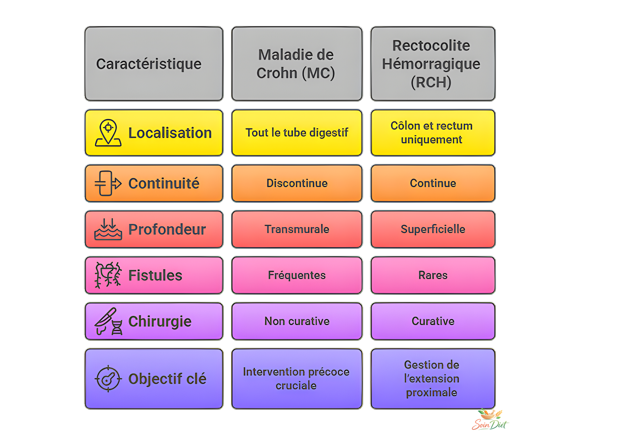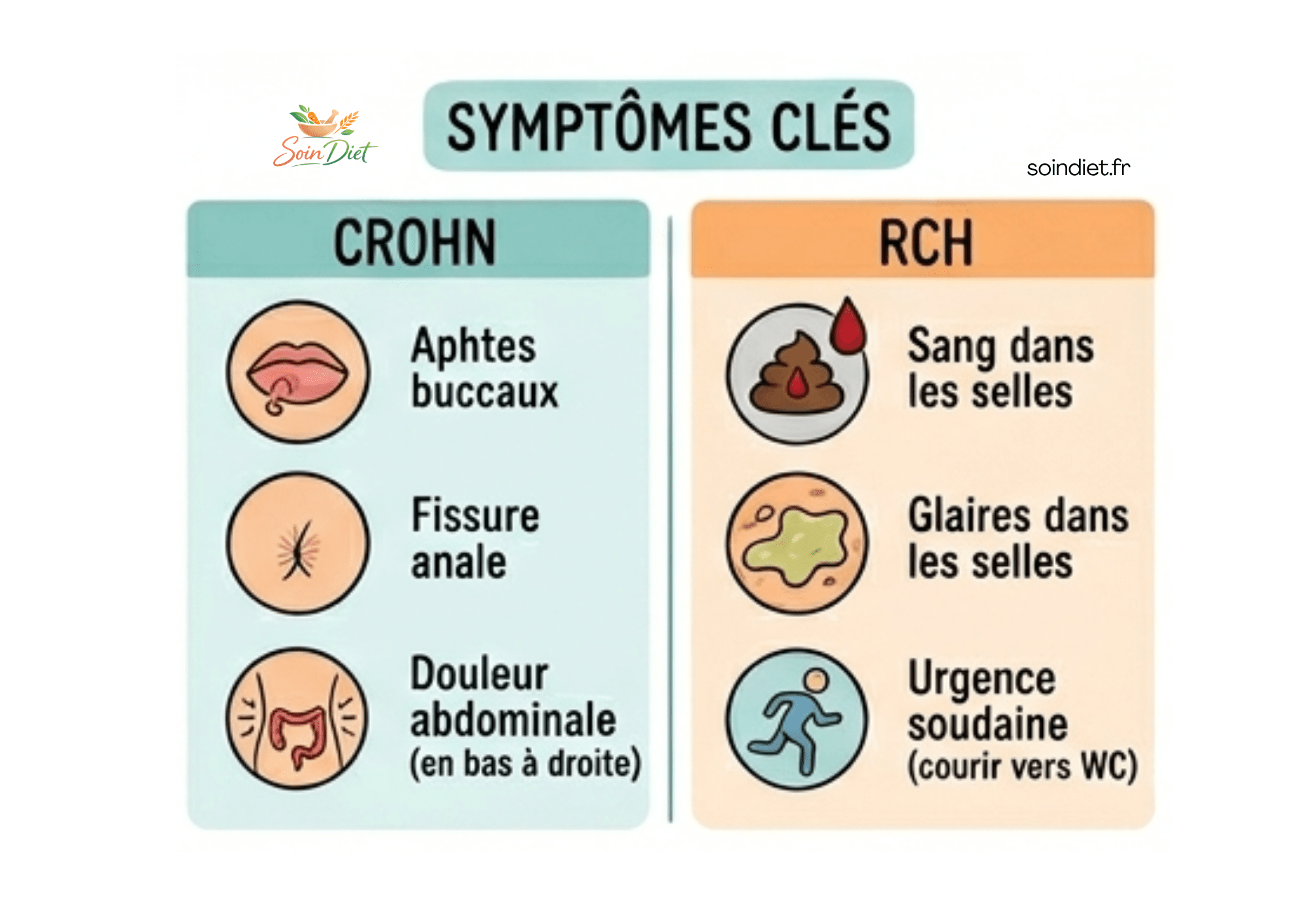 À retenir : la RCH reste dans le gros intestin, tandis que la maladie de Crohn peut concerner l’ensemble du tube digestif et se présenter par plaques.