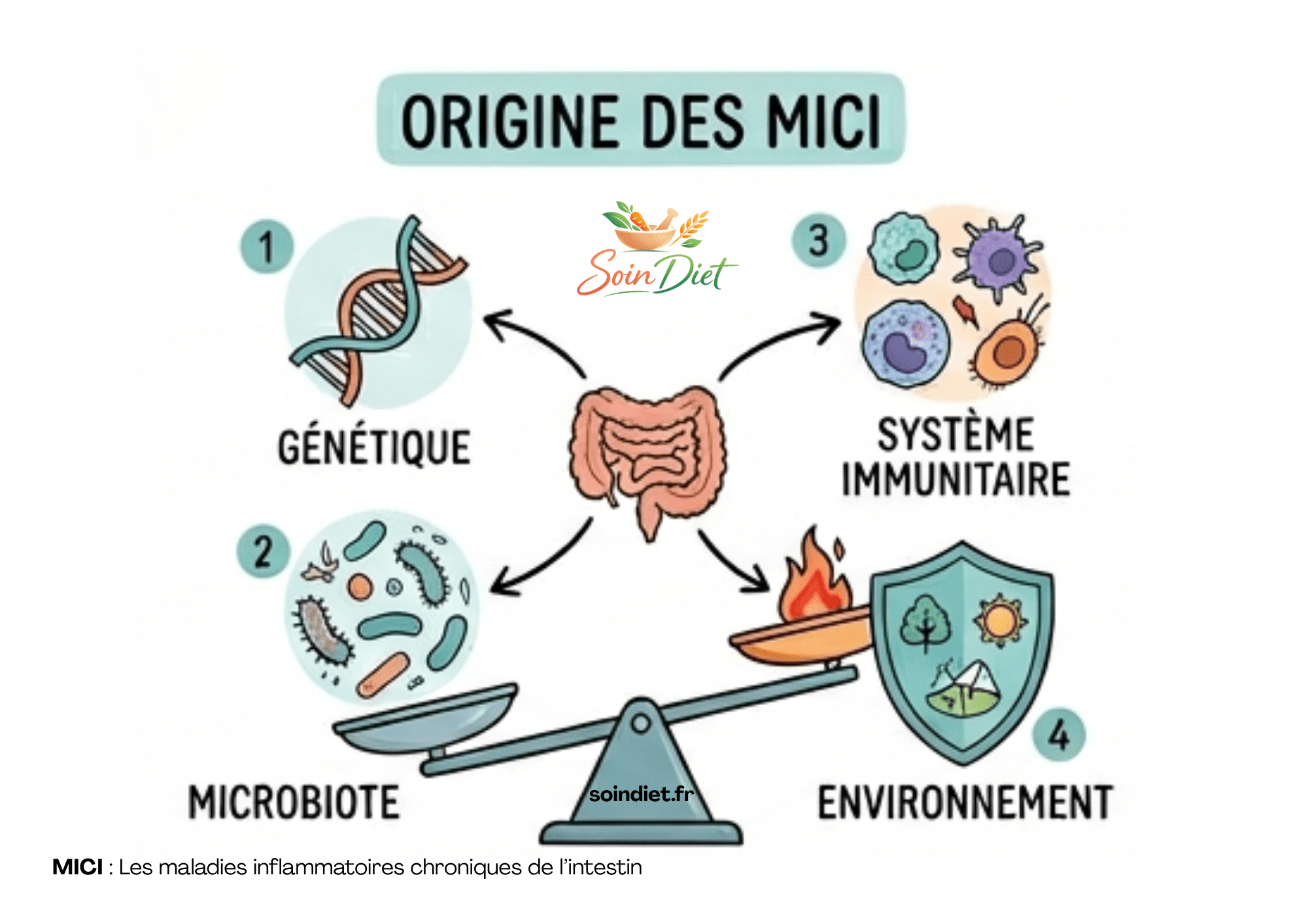 Les causes exactes restent inconnues, mais les recherches montrent qu’elles impliquent une interaction complexe entre la génétique, le microbiote intestinal, l’environnement et le système immunitaire.