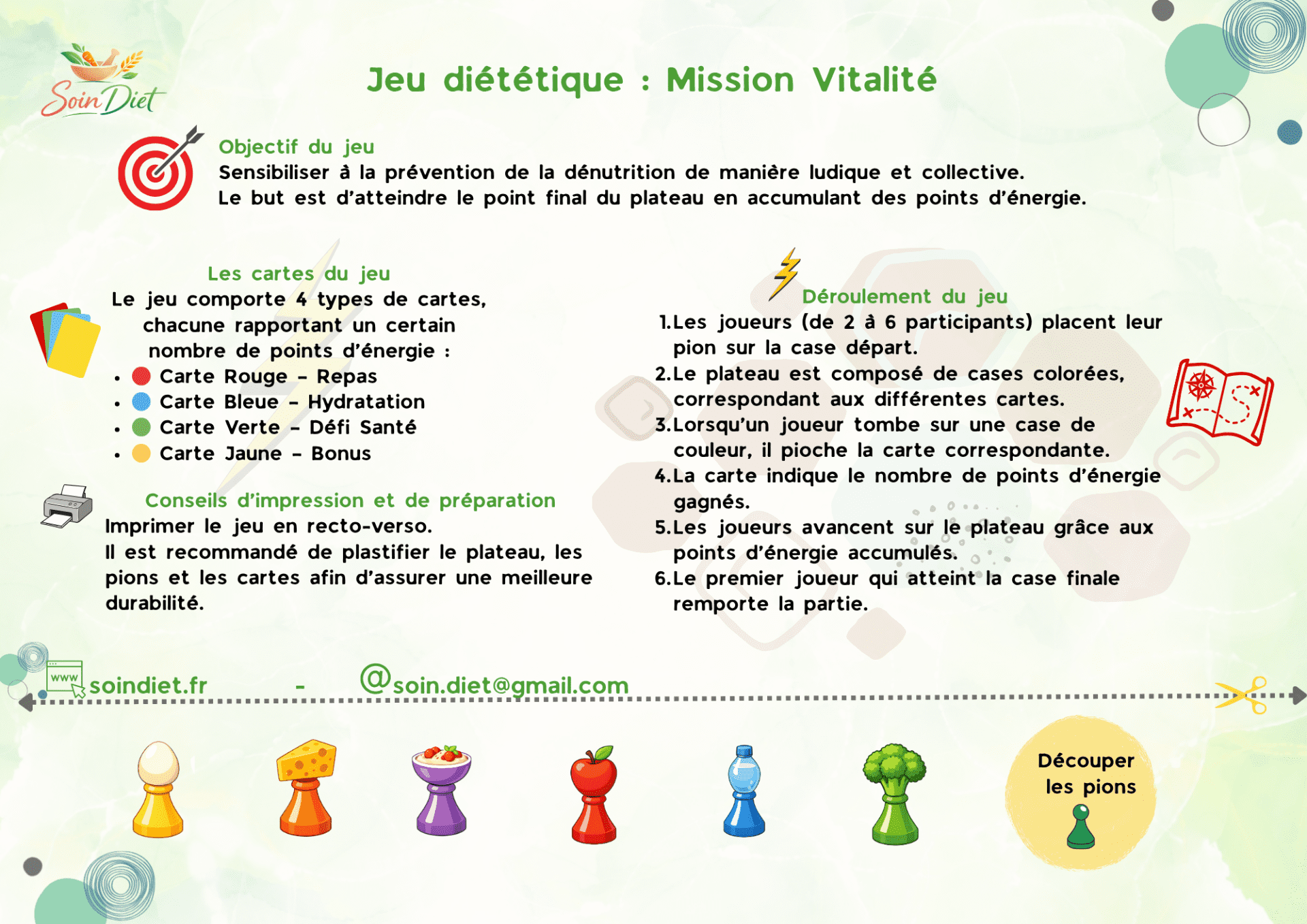 Pour y parvenir, piochez et jouez les quatre types de cartes. La carte Rouge met l’accent sur l’équilibre alimentaire. La carte Bleue rappelle les bons réflexes d’hydratation. La carte Verte propose un défi santé qui invite à à réfléchir. Enfin, la carte Jaune offre un bonus, un coup de pouce qui peut faire la différence.